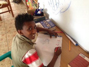Sandra Kemp, a nurse from Leicester, runs a project to improve hygiene practice at the nearby Gondar Hospital and is a long-time supporter of the Kindu Trust. She took time off from this vital work to visit Kindu this year bearing pencils, pens and paints. 27 children, mainly from grades 6 and 7 (aged 12-14) were eagerly awaiting her, sheets of paper at the ready.