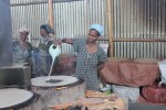 Injera forms the basis of the Ethiopian diet. It is a large, flat pancake made from fermenting a grain called tef, and is eaten at breakfast, lunch and dinner, often accompanied by shiro (a sauce made from chick pea flour) or wat (stew).
