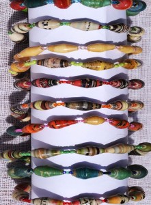 The magazines are cut into long strips and then rolled tightly and varnished. The patterns visible on the beads are the result of the compressed pages which creates a beautiful array of colours across the face of the beads. Beads are neutral colours with bright lines of blue, green or red and brightly coloured small beads interspersed. Each piece is unique!