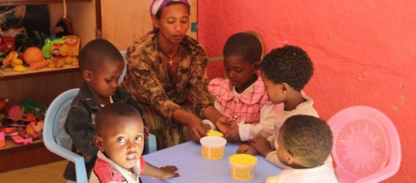 The Kindu Playgroup is a pre-school nursery group that gathers every weekday in morning and afternoon sessions from our compound in Gondar. The children are provided with a safe, clean and stimulating environment in which to play, socialise and learn together. Books and toys donated from our supporters around the world are available for use by the children.